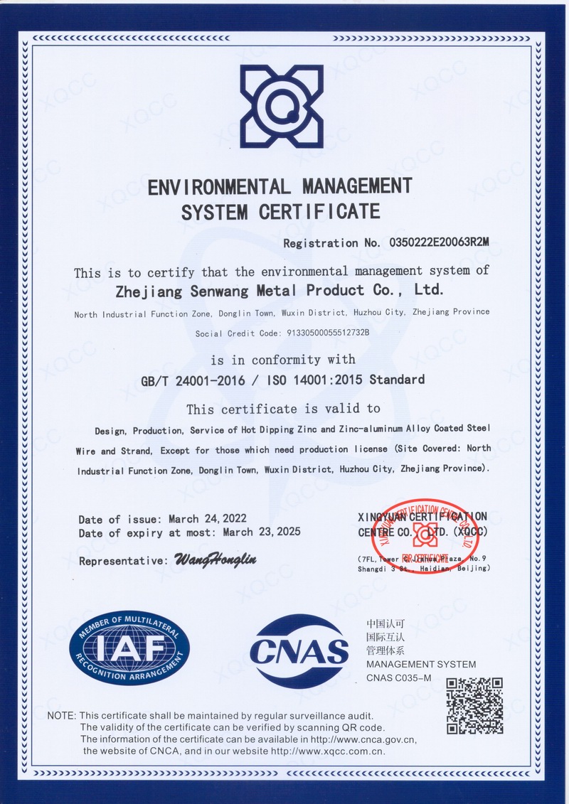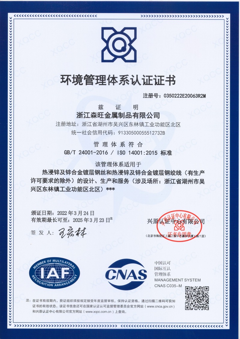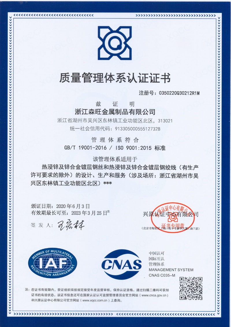 浙江森旺金屬制品有限公司成立于2012年,坐落湖州市吳興區(qū)東林鎮(zhèn)工業(yè)功能區(qū)。公司專業(yè)從事各類鍍鋅鋼絲、鋼絞線等產(chǎn)品的開(kāi)發(fā)及生產(chǎn)。目前產(chǎn)品已廣泛應(yīng)用于各類通信光電纜,電力輸送,電氣化鐵路工程,各類堤壩防護(hù)及農(nóng)業(yè)溫室等工程領(lǐng)域。公司秉承“追求卓越品質(zhì),創(chuàng)建卓著信譽(yù)”的經(jīng)營(yíng)理念,始終堅(jiān)持專業(yè)化、規(guī)模化的經(jīng)營(yíng)模式。